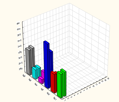 Figure 10: Average leaf area of 6 Crassulae shoots, 5 months after planting. 1, 2, 3 - experimental group - irradiated with a resonator with Al. 4, 5, 6 - control. Z-axis - mm2, X-axis - month of observation, Y-axis - shoot numbers