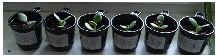 Figure 16: 6 shoots of Crassulae 2 months after planting. 1, 2, 3 - experimental group, irradiated with a resonator with W. 4, 5, 6 - control(left to right).