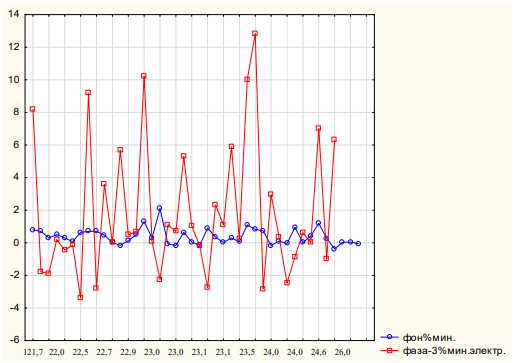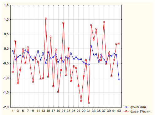 Figure 18: Changes in the PMT signal - % min. when recording radiation from a plastic hollow resonator with Al inside, for 42 separate experiments. Blue curve - background, red curve - phase 3 (Al plate is electrified - 5v ~ 15 min.). Along the ordinate axis: % min., along the abscissa axis - TOC