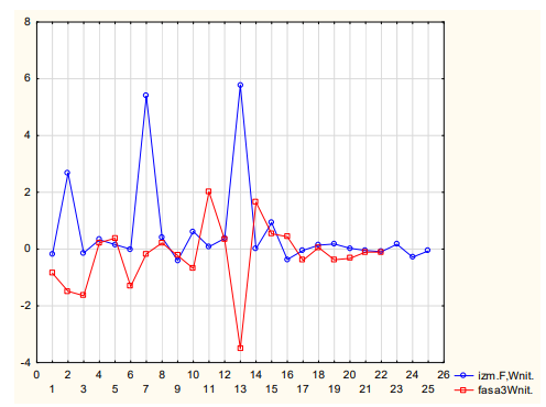 Figure 19: Changes in the PMT signal during sequential registration of radiation (Pase-3) from a resonator with W (a fragment of an incandescent lamp filament is irradiation -250nm , 15 min.) over 25 days. Along the ordinate axis: % in min., along the abscissa axis: number of days