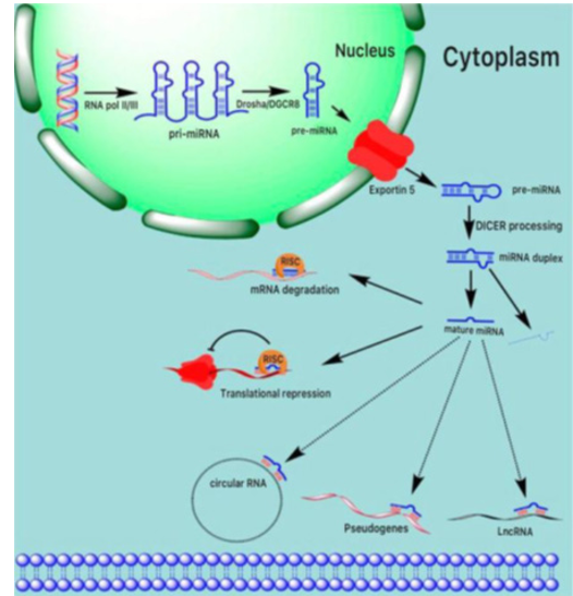 Winter et al viewed that the biogenesis of mature miRNA in-volves a series of biological processes. Firstly, the primary miR-NA (pri-miRNA) is transcribed by RNA polymerase II or III in the nucleus, forming an elongated RNA hairpin structure that is subsequently cleaved by Drosha into a small stem-loop structure of~70 nt, (pre-miRNA). The pre-miRNA is exported from the nu-cleus into the cytoplasm by exportin-5 and the loop is cleaved after the pre-miRNA is loaded onto Dicer, producing a double-stranded structure of miRNA and antisense miRNA. The latter is normal¬ly degraded, however the long (~22 nt) mature miRNA strand is integrated into the miRNA-induced silencing complex (mRISC), resulting in mRNA degradation or translational repression. Mature miRNA levels are regulated via binding to ceRNAs such as circu-lar (c) RNAs, pseudogenes, and lncRNAs, which act as sponges to prevent miRNA binding to target mRNA [7]. See (Figure1).