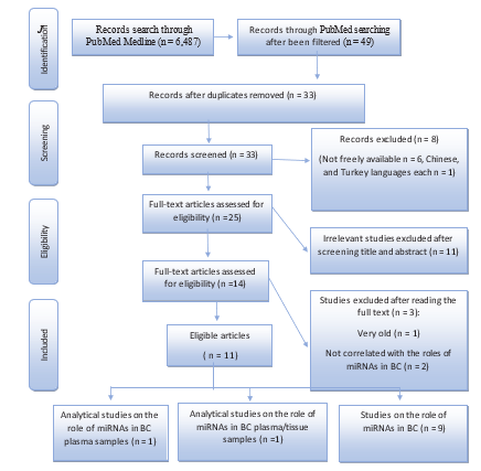 The search strategy retrieved 48 articles. 16 of these articles were duplicates, 6 were not freely available, 2 were not in English, 11 were irrelevant, 2 were not pertinent, 1 was earlier than 2010, and 11 were eligible. The above-mentioned steps concerning the se-lection of studies are illustrated in detail in (Figure2). Therefore, a total of 11 articles were included in this systematic review, and the role of 3 miRNAs molecules as oncogenes & biomarkers is described in (Table1). According to the results presented in Table1, 81.8% of published studies have not taken into account statisti¬cal analysis to assess the role of miRNAs in breast cancer. Since (45.4%) of the studies focused on oncogenic miRNAs, and their associated genes in BC, 27.3% of their main goal is breast can¬cer, its classification, and tumor grades, 9.1% of the articles ad¬dressed miRNAs as biomarkers, and the rest studied the processes of miRNAs biogenesis), the remaining 18.2% were quantitatively analyzed for the role of miRNAs as oncogenes and biomarkers in breast cancer.