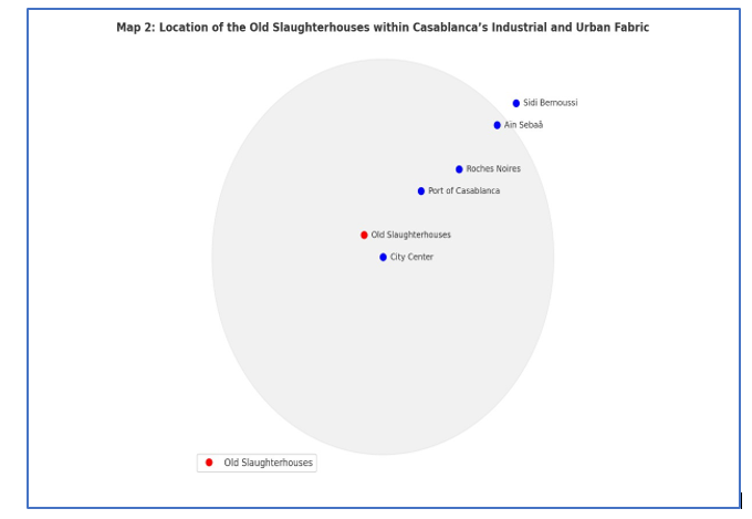The map highlights the strategic location of Casablanca’s Old Slaughterhouses (1912–2002) within the city’s industrial and urban system:
