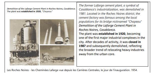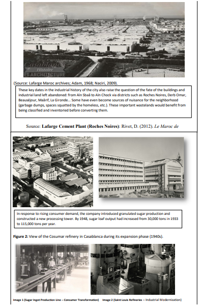 The industrial trajectory of Casablanca is inseparable from the city’s transformation into Morocco’s economic capital. Beginning in the early twentieth century, the expansion of the port of Casablanca (1907–1912) provided the necessary infrastructure for large’scale trade and the inflow of foreign investment [2]. This infrastructure laid the foundation for the establishment of agro’industries (such as flour mills, oil processing, and food canning) and later textile production and cement manufacturing, which became strategic pillars of Morocco’s modernization. From the 1920s onward, Casablanca witnessed the growth of specialized industrial neighborhoods. Roches Noires, located near the port, hosted warehouses, energy facilities, and textile workshops.