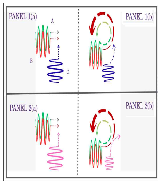 As the aggregate grows — two bonded waves becoming four, then eight — its total resonance energy increases faster than its primordial mass-based binding capacity. Once the internal resonance becomes too energetic or too complex to remain coherent, the structure undergoes partial fragmentation. Crucially, the fragments do not revert to their original frequencies. Instead, they retain the acquired resonance signature of the composite state. This inherited frequency acts as a proto-identity: a resonance imprint that governs how the fragments interact with their environment (figure 4). If compatible energy is available — precursors to metabolic intake — the fragments can reassemble with resonance-matched partners, reconstructing the original composite structure. This is a primitive analogue of mitosis: replication through resonance inheritance rather than genetic encoding. When compatible partners are absent, the fragments accelerate toward larger structures with overlapping but non-identical resonance profiles. Because the mass distributions differ while the frequencies partially align, the interaction produces rotational coupling. The fragment enters a spiralling orbit — a “waltz” — around the larger structure. This spin emerges naturally from weak affinity combined with asymmetric mass and partial resonance matching.
