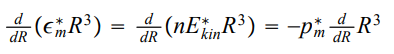 where ε*m,ε*kin p*m denote energy density mean kinetic energy, and pressure of the relativistic baryonic gas. Hereby we have excluded, as a result of energy changes, the creation of new cosmic particles (i.e. generation of baryons of mass m0! At temperatures with KT m≥ c2). The mean kinetic energy ε+kin relativistic baryons with particle density n = n(R) thereby is given by the following expression: