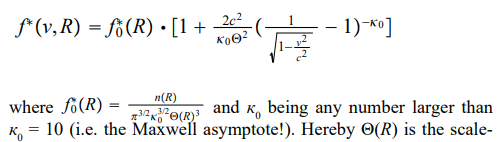 Not knowing apriory anything better, we may assume that in the initial phase of the cosmic expansion under conditions of very dense cosmic gases the distribution function is very likely close to an LTE equilibrium Maxwellian, - of course however one, which takes care that no superluminal particles with v ≥ c are admitted [4]. The latter can be taken care of by introducing, instead of v, the kinetic particle energy as a variable and then finally obtaining the function f*(v, R) in the following form of an asymptotic Kappa- function: