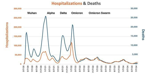 The dramatic changes in death and hospitalization rates were driven by variants, therapeutics, and immunity from vaccinations and/ or previous infections. Once the first Omicron waves passed, the percent of hospitalized people who died from COVID-19 stabilized around 10% until May 2024 as dramatically demonstrated on the next chart [2].