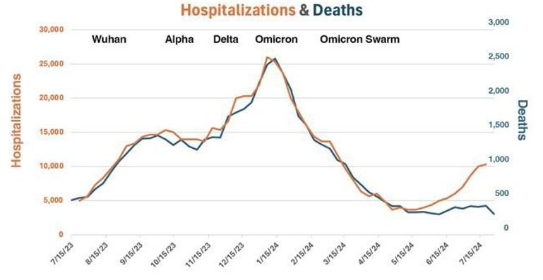 This paper will try to unravel the cause of the recent divergence in hospitalization and death rates [3]. As we progress, keep in mind that death rates are a complex function of vaccination history, vaccination effectiveness including waning, previous infections, variants, therapeutics, and comorbidities. Also keep in mind that from August 1, 2023, to August 1, 2024, the US had: