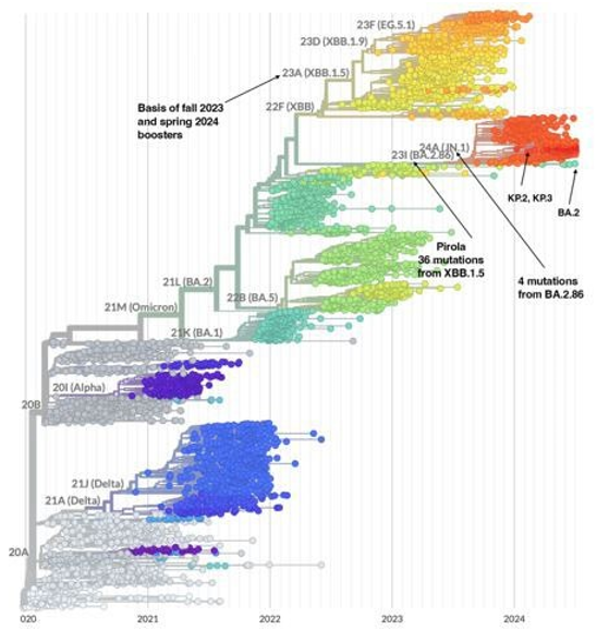 When the Pirola variant, BA.2.86, arose in August 2023, its 36 new mutations alarmed the world. This alarm was exacerbated by Pirola being on a distant evolutionary path from Kraken, XBB.1.5, upon which the 2023 fall and 2024 spring boosters were based. Yet again, however, Pirola was a sheep in wolf’s clothing. Though BA.2.86-based variants were much more transmissible than XBB.1.5-based variants, Pirola evolved to have a significantly lower-case fatality rate.
