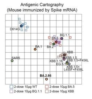 Very importantly, again notice from the image above that Pirola (BA.2.86) was not a descendant of XBB.1.5. Therefore, it was reasonable to expect that the XBB.1.5-based boosters would be less effective on BA.2.86 and its descendants than on XBB.1.5 and its descendants. The following antigenic cartography image from Twitter provides the explanation [18,19].