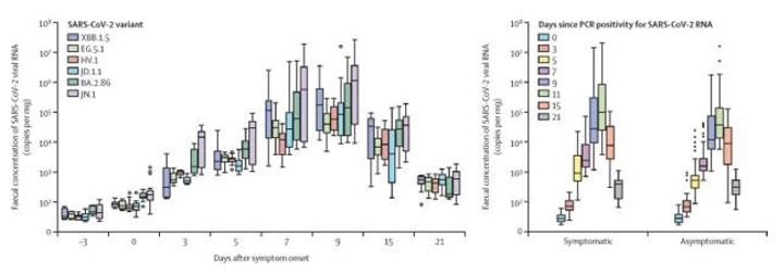 For recent variants, Lancet presented fecal shedding data for SARS-CoV-2 in individuals infected with XBB.1.5, EG.5.1, HV.1, JD.1.1, BA.2.86, and JN.1. Fecal samples were obtained from 113 non-hospitalised individuals with confirmed SARS-CoV-2 PCR positivity. Notice the dramatic differences in fecal shedding rates for these closely related variants [21].