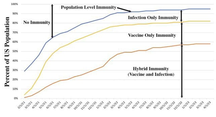 One can become somewhat protected from COVID-19 hospitalization or death if one has some form of immunity from SARS-CoV-2 infection. Immunity comes from vaccination, infection, or both infection and vaccination, which is called hybrid immunity. Population immunity is the percent of the people who have some form of these three types of immunity [22].