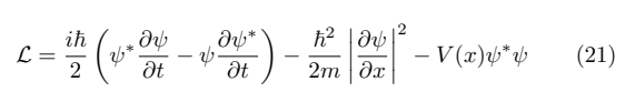 In our quantum mechanical formulation, we construct the Lagrangian density as follows: We start with the Lagrangian for a non-relativistic free particle described by the Schrödinger equation with a potential V (x),
