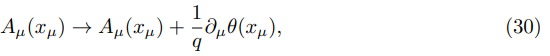 under a U(1) transformation.Here ∂µ = ∂/∂xµ. This transformation ensures that the covariant derivative, Dµ = ∂µ − iqAµ, transforms in the same way as the wave function,