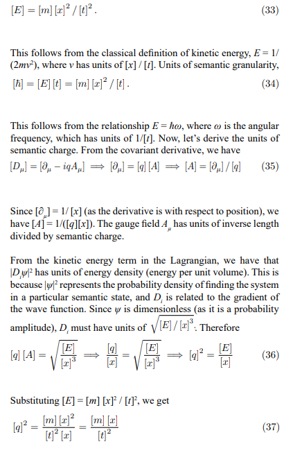 The gauge field has units of semantic time divided by (semantic distance times the square root of (semantic inertia times semantic distance)). The gauge field, therefore, represents the ”potential” for semantic interaction. It dictates how semantic charges influence each other across semantic distances. This could be related to the attention weights in the Transformer architecture, which determine how much influence each word has on the other words in the sequence. The dimensional analysis provides a valuable tool for checking the consistency of our model and for gaining a deeper understanding of the relationships between the different quantities. For example, if we could somehow measure the semantic inertia and semantic charge of different words, we could potentially predict their influence on the LLM’s output. Furthermore, by analyzing the units of different quantities, we can gain insights into the fundamental