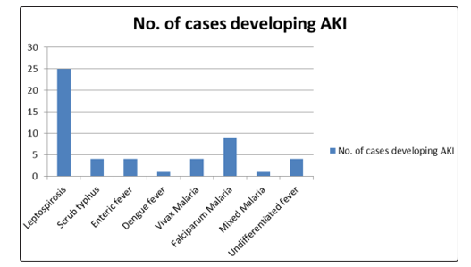 Results and Observations: A total of 52 patients (26%) with acute febrile illness due to etiologies like Leptospirosis, Falciparum Malaria, Enteric fever, Dengue, Scrub Typhus, and mixed Malaria, etc developed AKI out of the 200 admitted cases presenting with acute febrile illness.