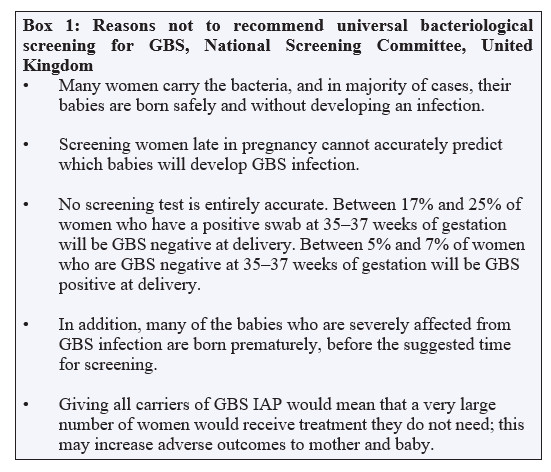 Mrs X is a 30-year old G3P1 (1 termination of pregnancy and 1 term normal vaginal delivery), with a history of GBS carriage during her previous pregnancy. She received IAP for that pregnancy, and her baby was not affected by EOGBS. When she booked in the first trimester of her third pregnancy, she was counselled to repeat screening for GBS at 35-37 weeks. At 34 weeks, fetal growth restriction (FGR) was detected on ultrasound, with estimated fetal weight centiles declining from 33.3% at 28 weeks to 9.7%. She declined inpatient monitoring and missed her scheduled visit at 36 weeks. At the subsequent follow-up visit at 37 weeks and 2 days, ultrasound studies continued to show FGR, with the estimated fetal weight declining to the 5th centile. She was advised delivery and consented to induction of labour. She was not given IAP in accordance with the ACOG guidelines and had a normal vaginal birth after a quick labour. Two days later, the baby presented with multiple episodes of regurgitation associated with fever and was diagnosed with EOGBS meningitis based on positive blood and lumbar puncture cultures. Reviewing the Guidelines The core difference between the RCOG and ACOG guidelines for prevention of EOGBS are their opposing stances on antepartum screening for GBS. The ACOG in conjunction with the CDC guidelines in 2010 recommends universal screening with a lower vaginal and rectal swab culture, while the RCOG opposes this. Box 1 cites the reasons the RCOG, in conjunction with the National Screening Committee is opposed to universal screening [5].