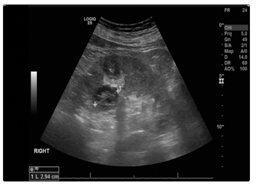 A previously healthy 47-year-old male was referred urgently to the renal department with a recent decline in kidney function, which was previously normal. Initial laboratory results revelated a creatinine of 183 umol/l, haemoglobin of 97 g/l and an MPO ANCA titre of > 221.9 iu/ml. When seen in the clinic he described reduced appetite, with 2 stone of weight loss over 1 month. His physical exam was unremarkable. Given his reduced renal function, he had an urgent renal biopsy which showed focal segmental necrotising glomerulonephritis with a single cellular crescent in keeping with ANCA associated vasculitis. However, two complex renal cysts were seen on ultrasound in his right kidney (Fig 1)and until malignancy was ruled out it was decided to treat with steroid monotherapy (prednisolone), not with cyclophosphamide. Initial response to this appeared to be effective, reducing creatinine from 214 to 126 umol/l.