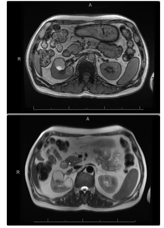 Fig (2): MRI both kidneys T1 signal (Top) and T2 signal (Bottom). The more anterior cyst contains an area of T1 high signal posteriorly which does not enhance appreciably and would be consistent with proteinaceous/haemorrhagic debris. The more posterior lesion demonstrates multiple septations.