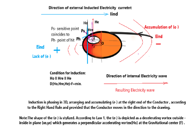 He secret of induction is that electrons are forced by external hits (Ho) to order, arrange, phased and directed to one end of the Conductor. The algorithm is follows: This outer hit (Ho) cause a primary decelerating transverse vortex (Law 5) from outside-in towards its Gravitational center (F). Thus this primary decelerating vortex is being developed in its own plane (xo, yo) that turns out to be perpendicular to outer hit (Ho).