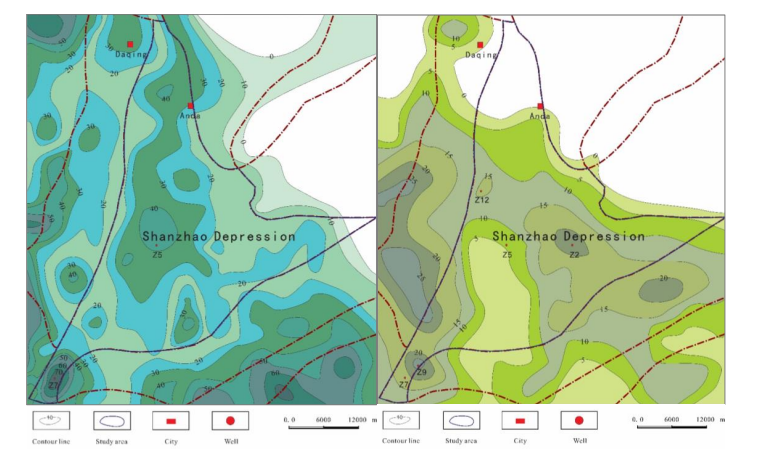 The cumulative thickness of the black shale of the first member of the Qingshankou Formation in the Sanzhao Depression was 10m to 75m, mainly ranging from 20m to 40m. Due to the influence of the sedimentary environment, the thickness varied significantly in different areas. The thickness of a single layer of black shale was 1m to 16m, mainly ranging from 3m to 10m. The planar distribution was centered around Well Z5 and Well Z7, forming a circular ring-shaped distribution that gradually thined out towards the periphery. The single-layer thickness of black shale was the largest near Well Z7, reaching 16m, and the cumulative thickness was also the largest, reaching 75m. In the northern part of the study area neared the edge of the depression, both the single-layer thickness and cumulative thickness were the thinnest (Figure 3). The cumulative thickness of the black shale of the second and third members of the Qingshankou Formation was 10m to 26m, mainly ranging from 15m to 20m. The thickness of a single layer of black shale was 0.2m to 7.6m, mainly ranging from 2.1m to 5.6m. The planar distribution showed an east-west zonal distribution feature. The eastern zone was centered Well Z2 and spread in a semi-circular shape towards the north and south sides, gradually thinning out. The western zone was centered Wells Z9 and Z12, and spread in a north-south strip shape, gradually thinning out towards the central and eastern parts. The single-layer thickness of black shale was the largest near Well Z9 in the west, reaching 7.6m, and the cumulative thickness was the largest, reaching 26m. Due to the influence of structural uplift, the thickness of the shale in the middle was thinner than that in the west and east (Figure 4).