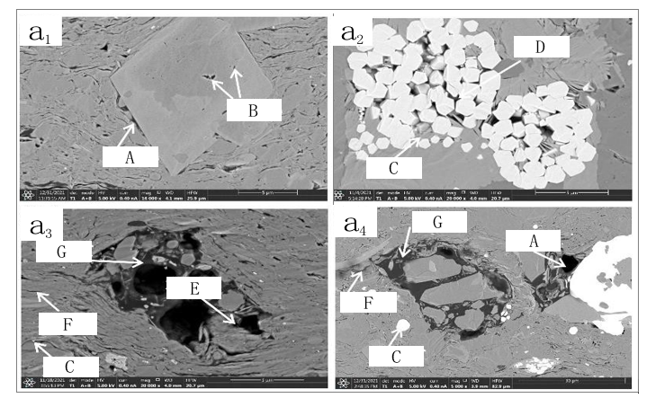 A: Intergranular pores of minerals; B: Intragranular dissolution pores; C: Pyrite; D: Intercrystalline pores of pyrite; E: Organic matter pores; F: Microfractures; G: Organic matter