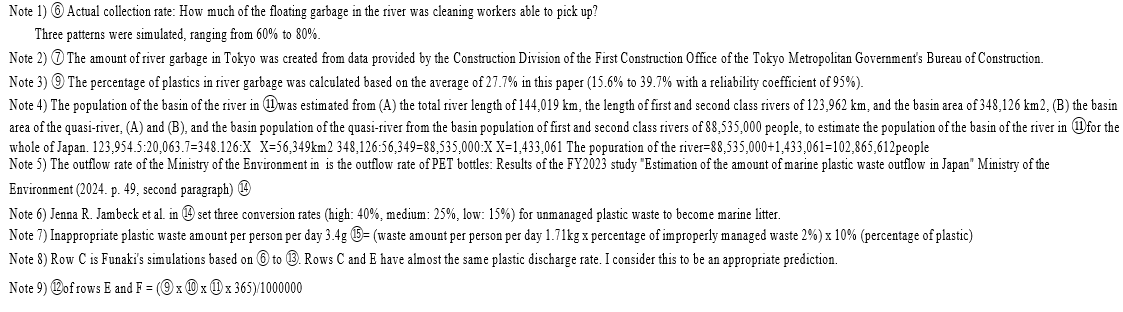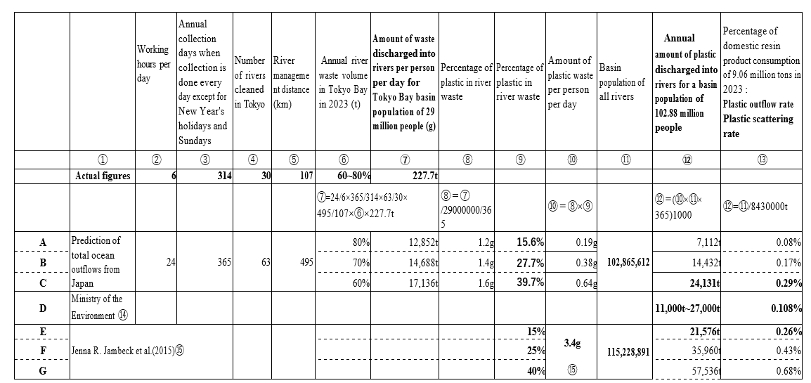 The amount of plastic discharged into rivers of 21,576 tons and the rate of discharge into rivers of 0.26% in row E by them are almost the same as the amount of plastic discharged into rivers per year of 24,135 tons and the rate of discharge into the ocean of 0.29% in row C of Funaki's prediction. The prediction in row D by MOE is also in the same range [8]. I believe that these are the most appropriate predictions. This value is the lowest prediction amount, since they predict the annual amount of plastic discharge into the ocean to be between 20,000 to 60,000 tons [9].