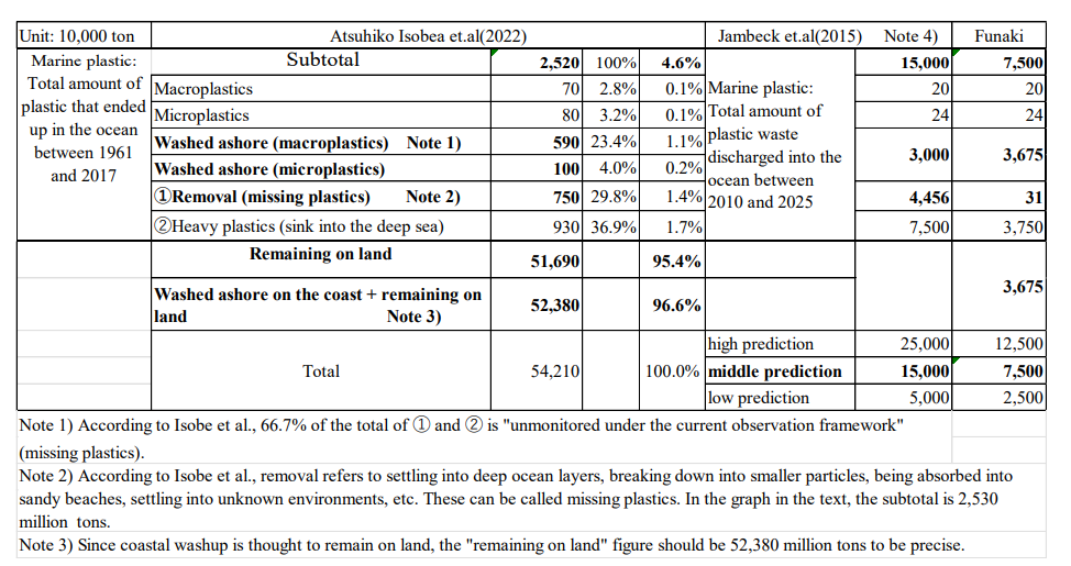 In contrast, Isobe et al. (2) predicts that the cumulative amount of marine plastic from 1961 to 2017 is 25.3 million tons, which is almost the same amount as Funaki's low prediction. I believe that Jambeck et al.'s prediction is excessive.