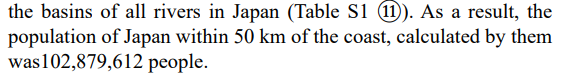 As a result, the population of Japan within 50 km of the coast, calculated by them was102,879,612 people. (123,954.5:20,063.7=348,126:X X=56,349km2