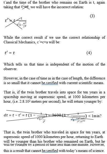 Another incorrect result is the calculation of time in different inertial spaces. That is, the time of a moving observer passes later than the time of an observer who remains stationary. For example, the Special Theory of Relativity mentions the case of two twin brothers, one of whom travels in space and the other remains on Earth. That is, if the time of the brother who travels in space is