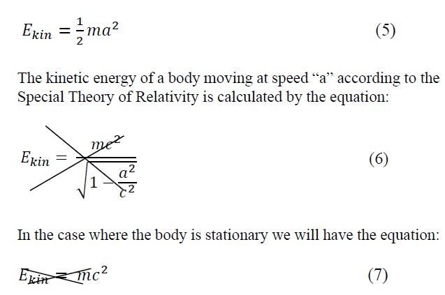 However, in Classical Mechanics, a stationary body, as shown by relation (5), has zero kinetic energy. This shows that equation (7) is an incorrect equation. However, Einstein claimed that equation (7) does not represent the kinetic energy of mass!!! But represents the internal energy of mass!!! Thus created the incorrect equation: