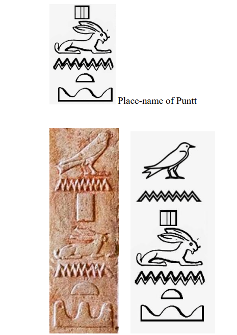 The Puntite ruler is flanked by two vertical columns of hieroglyphs. The right column comprises a swallow glyph, a water ripple glyph, and a cluster of hieroglyphs denoting the Place-name of Punt. Here, the water ripple symbol functions as a prepositional marker