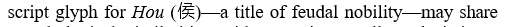 Over time, the Hou character underwent graphical evolution, with later script forms (e.g., bronze inscriptions) reinterpreting its components as an arrow superimposed on textile-like elements.