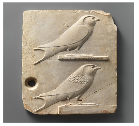 Figure 11: Relief Plaque Depicting Two Swallows, Dating to the Late Period of Ancient Egypt Through the Ptolemaic Period (circa400–30 BCE). Housed in the Metropolitan Museum of Art, New York, USA
