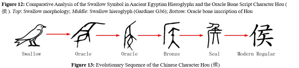 This study posits that the origins of Chinese characters may derive from ancient Egyptian hieroglyphs, a hypothesis supportable through comparative script analysis and cross-cultural parallels. In ancient Egypt, the swallow hieroglyph (nḫt, Gardiner G36) symbolized nobility or governance. By extension, the oracle bone