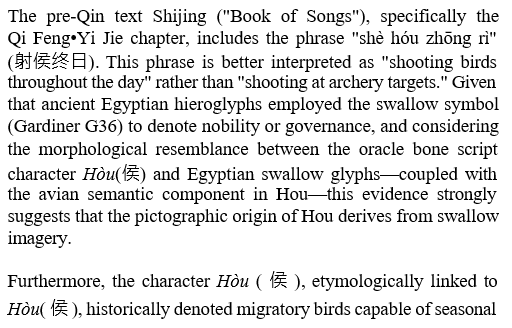 The Chinese character Hou (侯), an ancient noble title, shares striking etymological and typological similarities with the swallow symbol representing feudal lords in ancient Egypt. Comparative analysis reveals that the pictographic prototype of Hou likely derives from the swallow, as evidenced by parallels between its oracle bone script form and Egyptian iconography. In Liangzhu Culture jade artifacts, the recurring motif of a "bird standing on a platform" further supports this connection. Contrary to interpretations identifying the bird as an eagle, its morphological features align more closely with a swallow. This correspondence provides ancillary evidence suggesting cultural linkages between the Liangzhu Civilization and ancient Egyptian traditions.