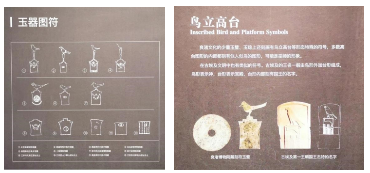 In a 2011 blog post on Sina Blog, the author posited that the "bird standing on a platform" motif prevalent on Liangzhu Culture jades exhibits striking morphological parallels to the serekh—a hieroglyphic emblem framing the Horus name of ancient Egyptian pharaohs. This observation was later echoed in June 2018 by the renovated Liangzhu Museum, which juxtaposed the Liangzhu motif with Egyptian serekh iconography for comparative analysis.