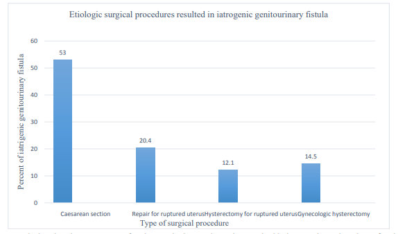 Following cesarean section this study also found the most frequent surgical procedures resulted in iatrogenic genitourinary fistula were Repair for ruptured uterus, hysterectomy for ruptured uter¬us and gynecologic hysterectomy constituting 20.4%,12.1% and 14.5% respectively whereas the findingof 18 years retrospective study of iatrogenic genitourinary fistula cases at 11 sub Saharan African countries revealedhysterectomy (19.8 %)is the major sur¬gical procedure that resulted in iatrogenicgenitourinary fistula fol¬lowing cesarean section followed by gynecological hysterectomy (19.6 %), ruptured uterus repair (3.1 %) [12].Therefore the find¬ings from this study shows there is a need for advanced training for improved decision-making and surgical skills in both obstetric and gynecologic surgeries, especially for safe cesarean delivery and hysterectomy. Unnecessary cesarean section delivery includ¬ing elective cesarean delivery rate have to be lowered to decrease the incidence of iatrogenic genitourinary fistula.