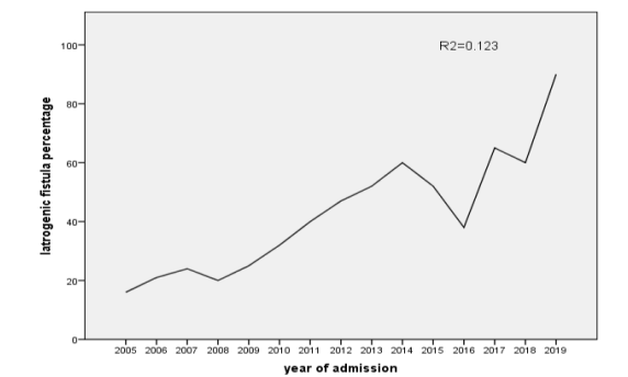A change point occurred over the years 2013-2016 where Iatrogen¬ic genitourinary fistula cases decreased significantly with APC of -6.39% (95% CI -3.7,15.7) but it significantly increased far more rapidly over the years 2016-2019 with APC of23.28% (95% CI 12.9,34.6).Another study which is a 14 years retrospective study done at Pakistan, institute of medical sciences found rising trend in iatrogenic fistula over the study period (2006–2018) from 43.5% to 71.4% and a decreasing trend in ischemic fistula, from 56.5% to 28.6%, was also observed [14].