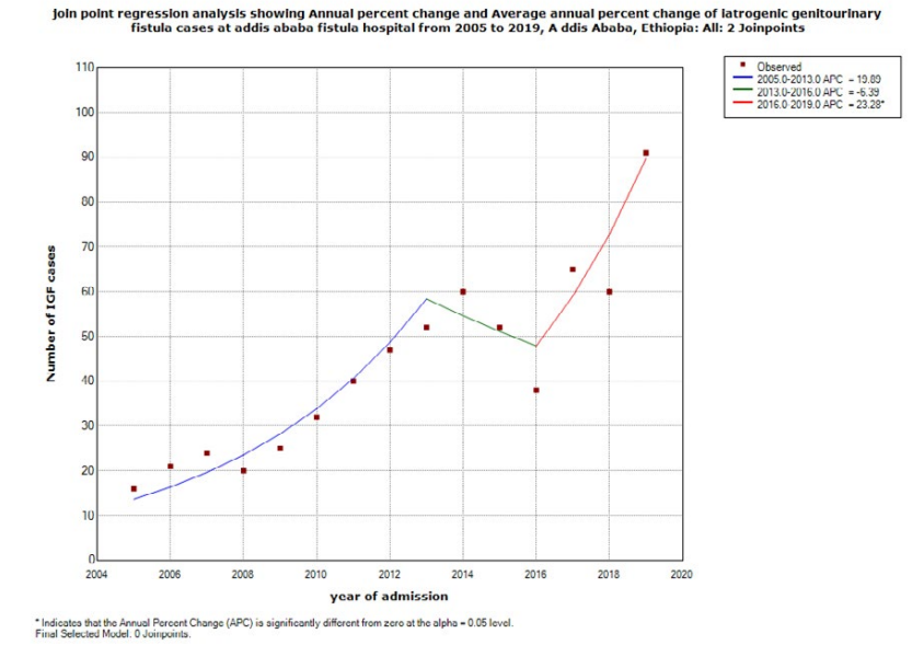 Methods: a facility based cross sectional study design was deployed. The respondents were included retrospectively using their medical history from January 2005 to December 2019 at Addis Ababa fistula hospital, Addis Ababa, Ethiopia. Data was analyzed using SPSS version 20.0 software. Annual percent change and average annual percent change were calculated using joinpoint regression analysis on joinpoint regression program version 4.8.0.1. Bivariate and multivariable regression model was also undertaken to implore the important risk factors for iatrogenic genitourinary fistula.