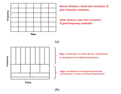 Unlike STFT, where the window size is fixed, the wavelet transform promotes windows with varying sizes to analyze various bandwidth segments within a signal. Mathematically the wavelet transform of a signal f(t) is given by [13]: