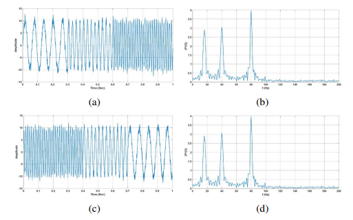 On the other hand, Figure 9 (a,b,c,d) explains the FT of a non- stationary signal and its flipped version. Although the signal structure is changed in the time domain, the FT displays the frequency components of the flipped signal in the same order as it is in the unflipped version of the signal, which clarifies that the FT is not the best solution for spectrum analysis of the non- stationary signals.