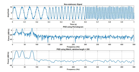Figure 13: Analyses of flipped non- stationary signal composed of , 16 ,40 and 80 Hz using Welch’s method