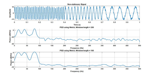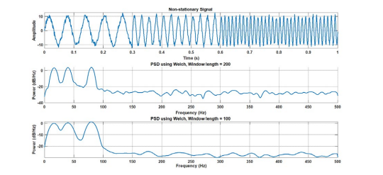 Figure 11 shows the power spectrum analysis of a stationary signal using Welch’s method of windows of lengths of 200 and 100 respectively. The figure shows peaks at the frequencies 16,40, and 80 Hz. The difference between using windows of different lengths appears in the resolution.