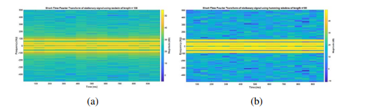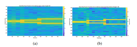 Figure 15: STFT analyses of non-stationary signal (a) using rectwin window (b) using hamming window