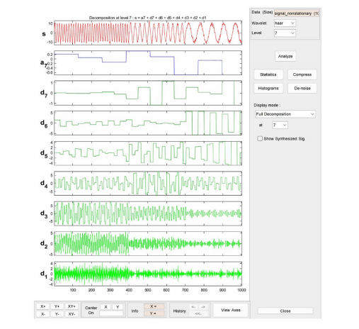 Multi-resolution analyses refer to splitting up a signal into elements, which construct the original signal precisely when summed back together. The signal elements typically describe the variability of the signal into physically meaningful and interpret-able components. As seen in Figures 14, 15, 16, and 17, STFT and Wavelet analyses give very good results for stationary and non-stationary signals. Besides, wavelet decomposition represents a powerful tool for multi-resolution analysis of non- stationary signals. For example, applying frequency wavelet-based multi-resolution analyses on non- stationary signals can play a significant role in filtering out the noise based on the noise frequencies. This process is referred to as wavelet-based de- noising. Wavelet-based de- noising is very important in the case of non-stationary signals where using power thresholding is not efficient due to the nature of the non-stationary signals, which are composed of variable amplitude components. Figure 18 shows how to use the MATLAB wavelet analyzer in analyzing the components of a non-stationary signal.