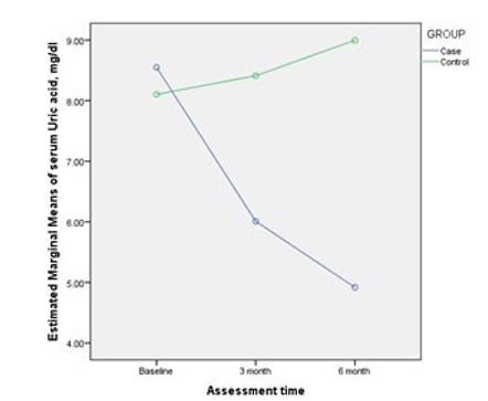 Figure 1: Time Course Change of Estimated Marginal Means of Serum Uric Acid Levels from Baseline through 6 Months in Both Groups
