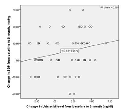 There was a significant positive correlation between the reduction of serum uric acid level and reduction of SBP in 6 months among the study subjects irrespective of the study groups (r = 0.235; P=0.047) (Figure 2).