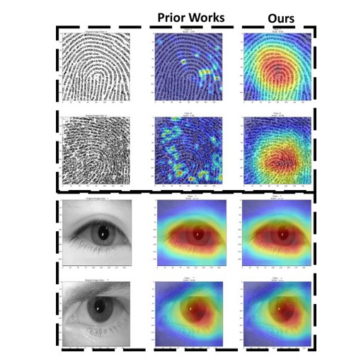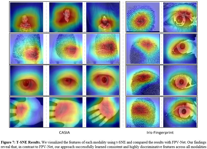 Grad-CAM Results. Grad-CAM is a widely applied visualization technique that can generate category activation maps, As show in Figure 7, demonstrating the critical regions that deep neural networks focus on during classification decisions [8]. We performed Grad-CAM visualization on input data for each modality, aiming to reveal the significant regions of attention across different modalities. Specifically, we observed that our method can effectively capture key regions in different modalities, such as faces, fingerprints, irises, and palm prints, successfully capturing the most discriminative feature regions for each modality. This fine-grained visualization technique not only enhances the model's interpretability but also validates the effectiveness of our proposed multi-modal feature extraction strategy.